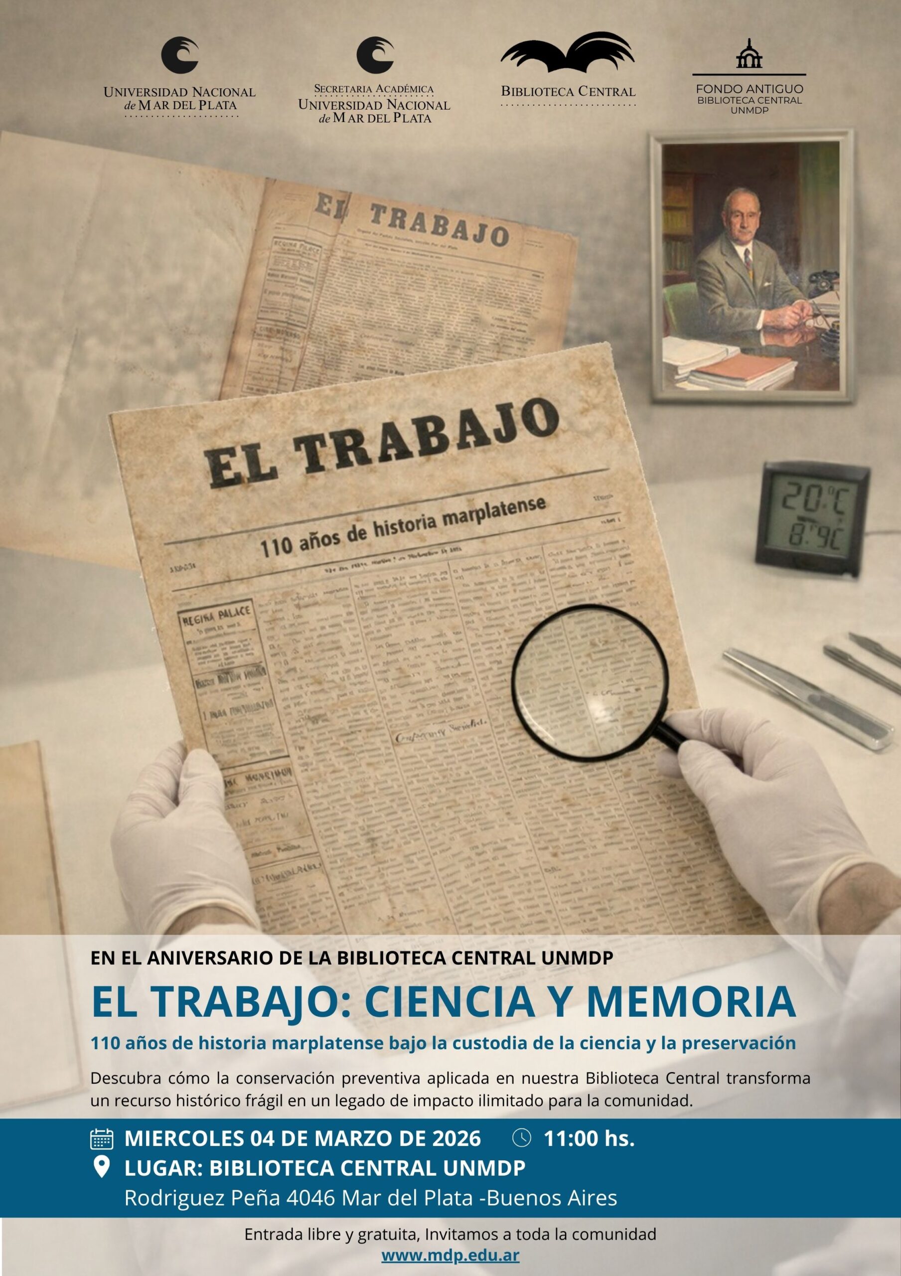 El miércoles 4 de marzo de 2026 la Universidad Nacional de Mar del Plata inauguró en su Biblioteca Central, la muestra “El Trabajo: Ciencia y Memoria”, una exposición que pone en valor uno de los fondos documentales más significativos de la historia local: la Colección del Diario El Trabajo. La misma fue declarada de Interés Turístico y Cultural por el EMTURyC.